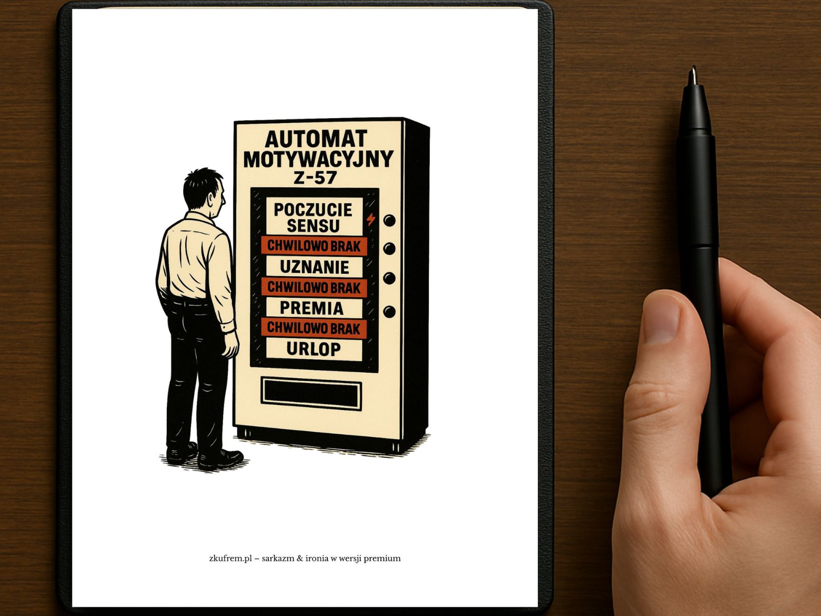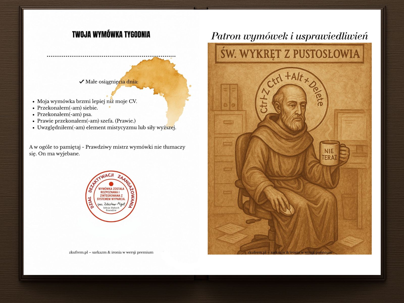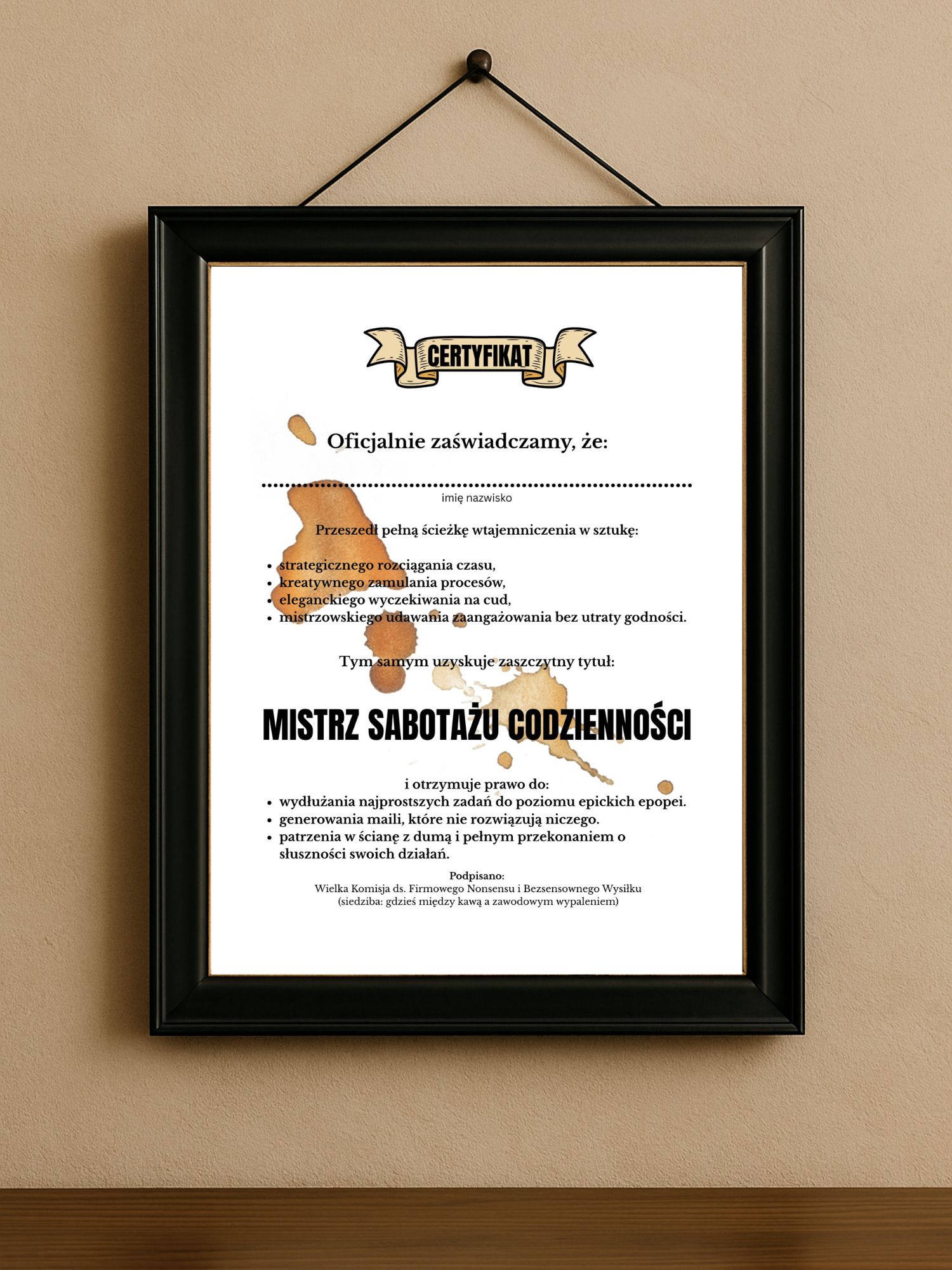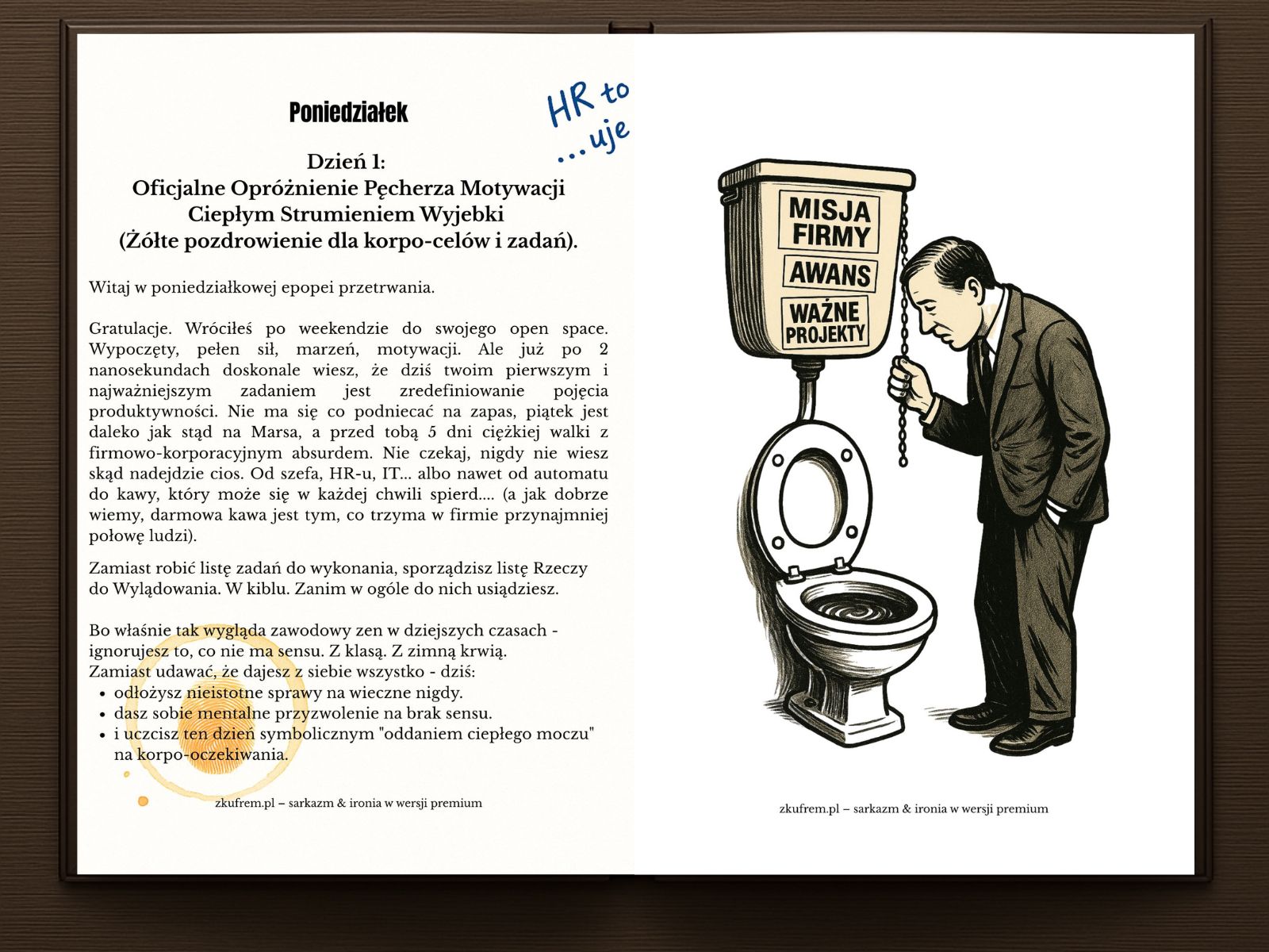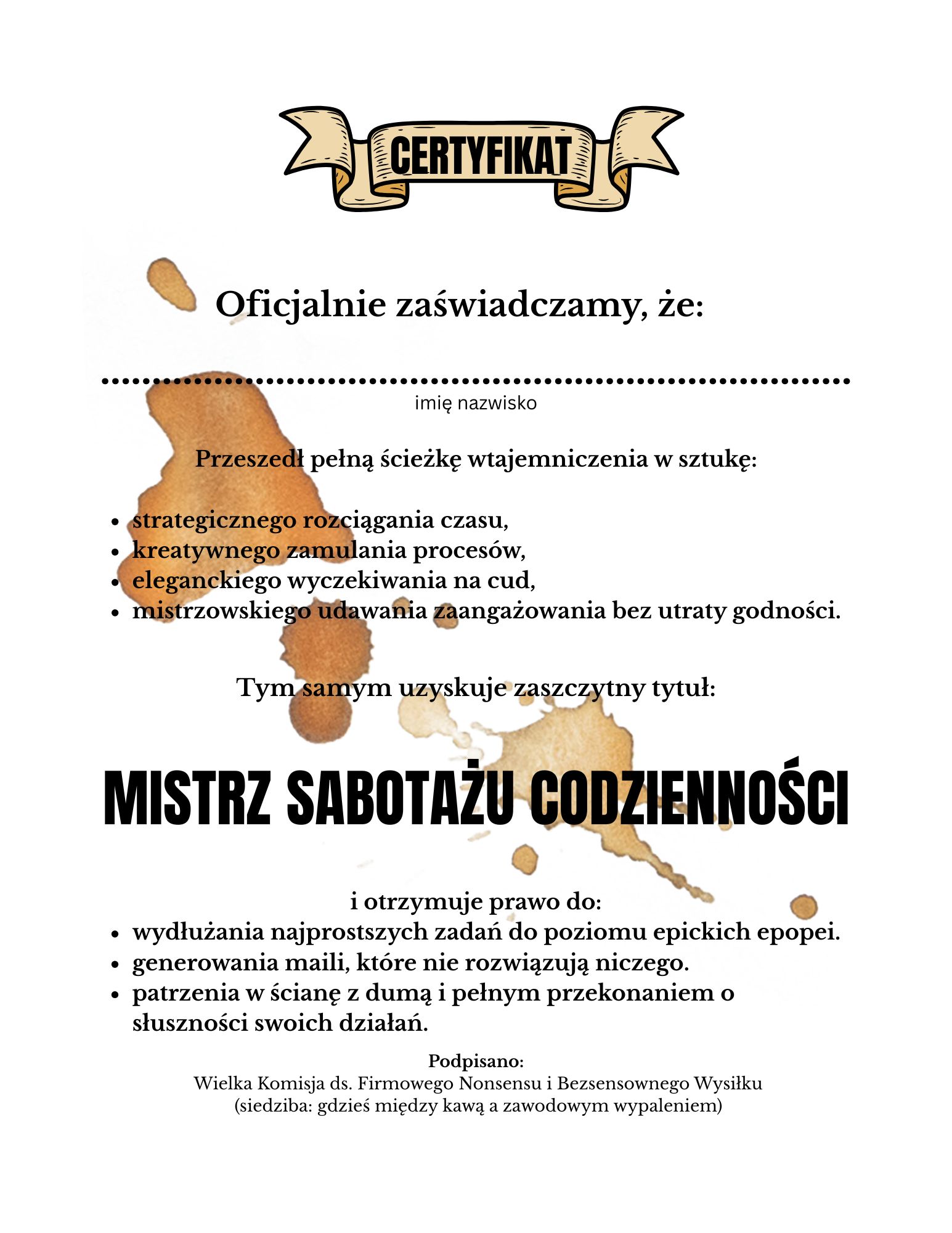 W środku: mikrosukcesy, które nikt poza tobą nie zauważy, certyfikaty z dupy i dawka ironii, po której nawet twój szef zacznie się zastanawiać, kto tu kogo zatrudnia.